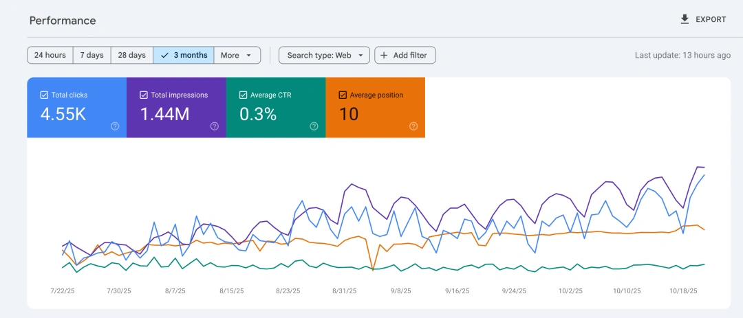 The data indicates steady growth in impressions and clicks, showing improved visibility in search results. Although the CTR remains low, the site has strong potential—most pages already rank around page one on Google. With continued content and metadata optimization, performance is likely to increase further.